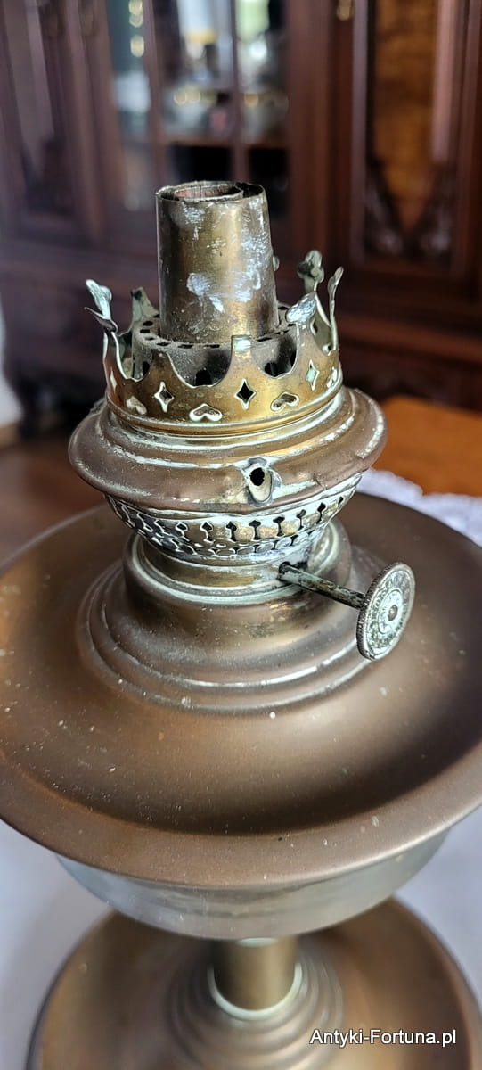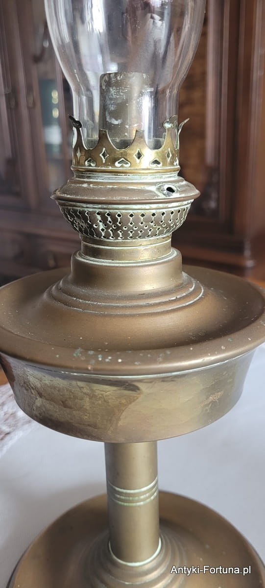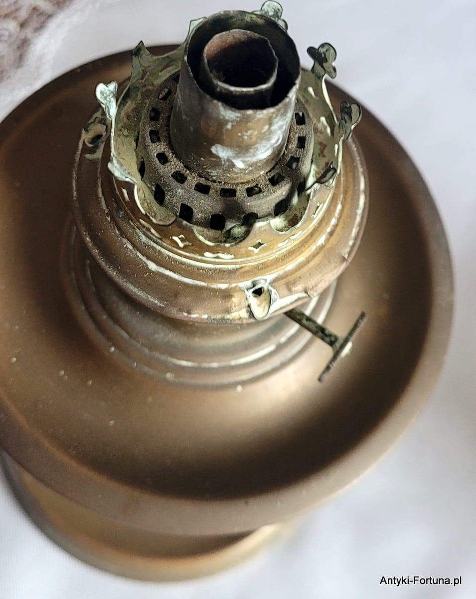 Stara lampa naftowa o wymiarach : wys całkow. 40 cm , wys bez komina 26 cm , śred podstawy 14,5 cm , śred zbiornika ok 13 cm , brak knota , stan jak na zdjęciach . Wykonana z blachy mosiężnej.